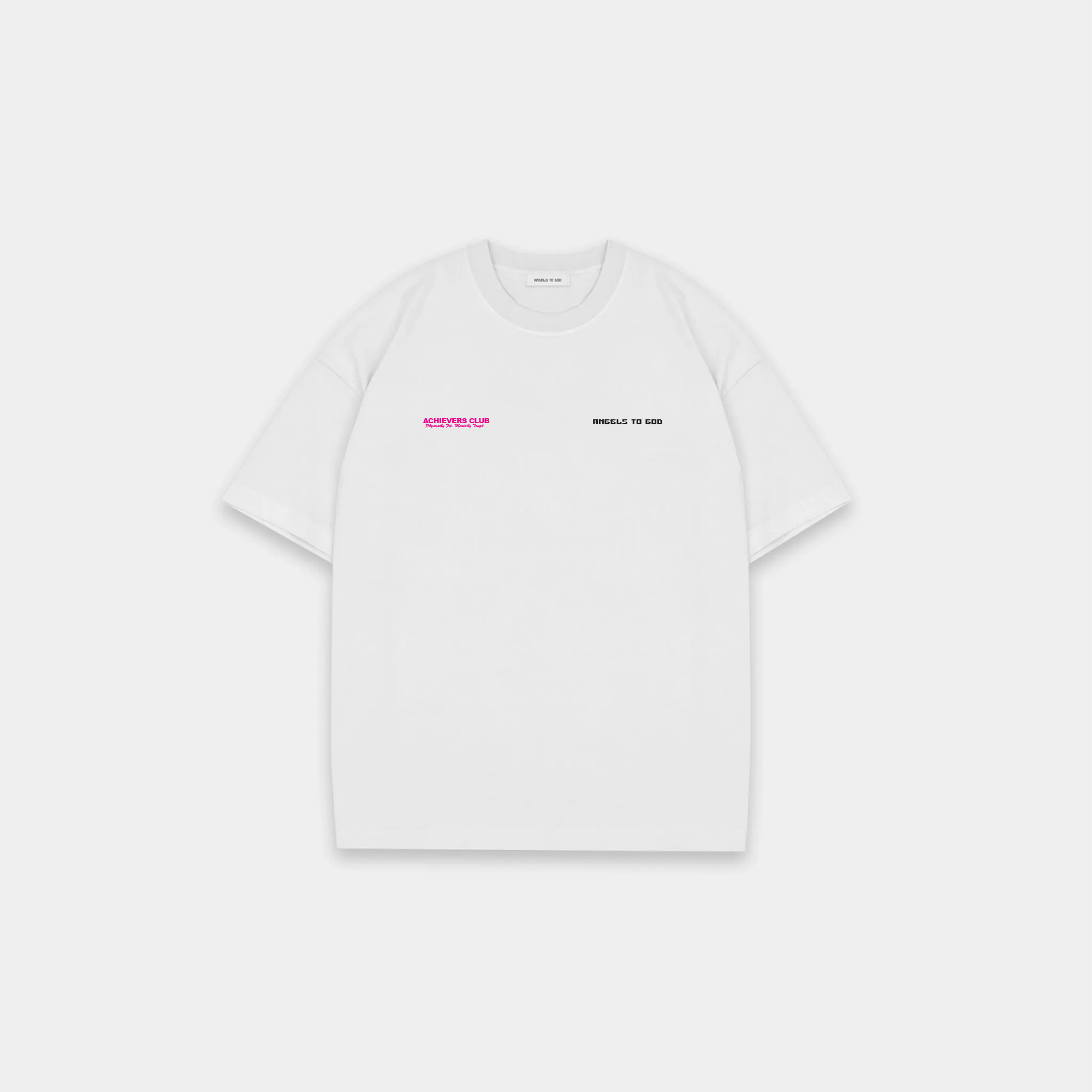 The Angels To God Achievers Club T-Shirt in White. Defined by our signature logo panel puff printed front and back. Angels To God front left chest print and Centre back print. Luxury-weight 300 GSM single jersey T-Shirt. Ribbed crewneck collar. Slightly oversized.