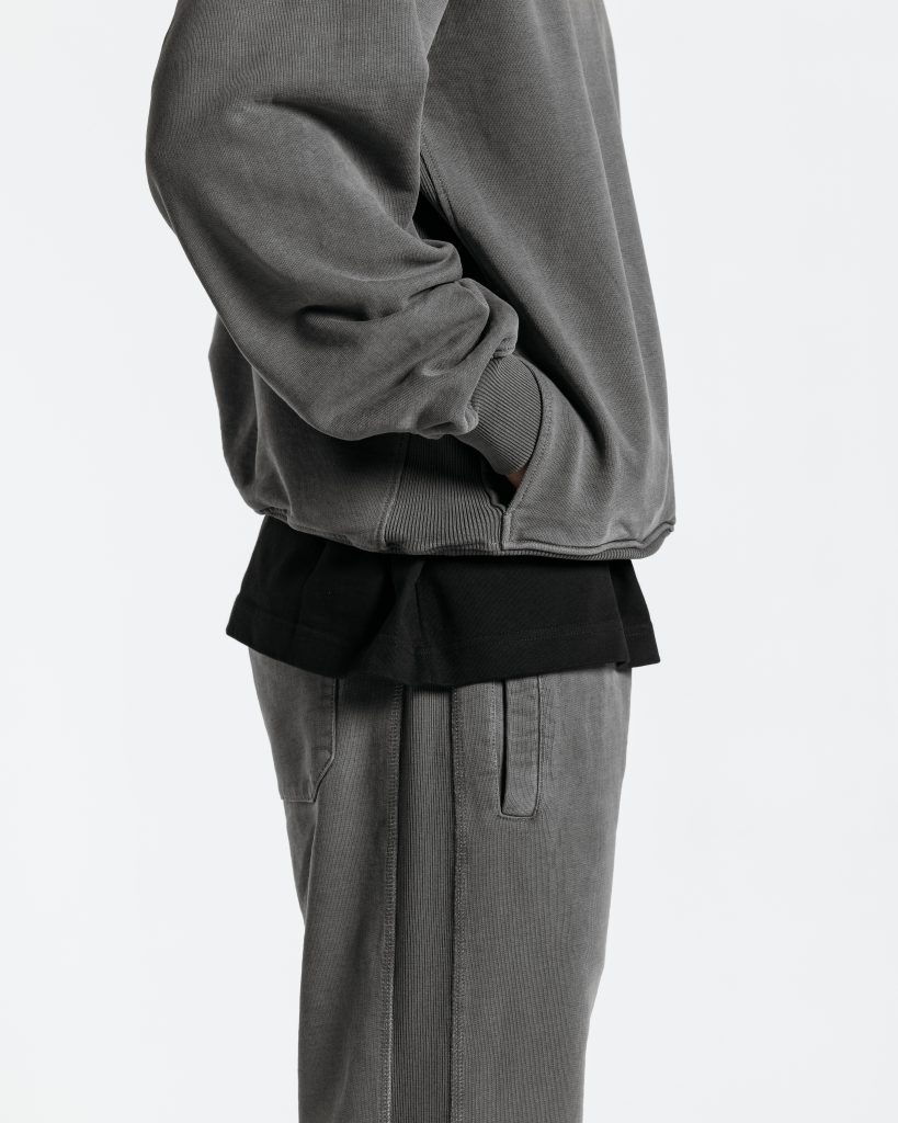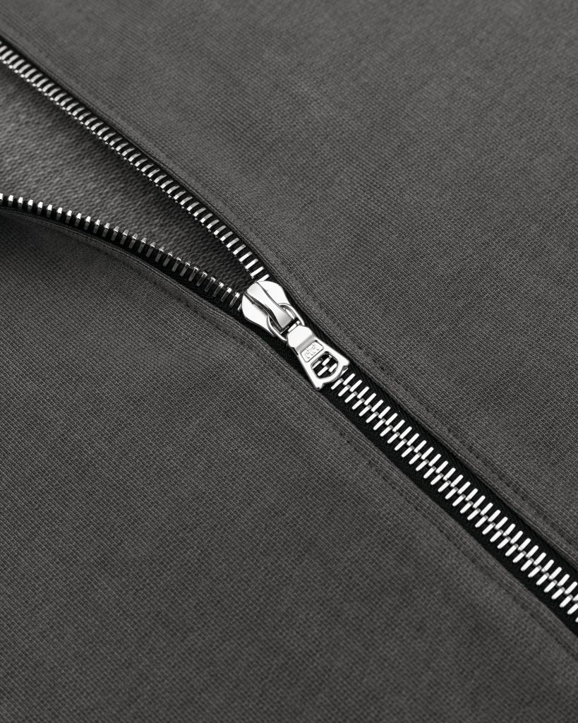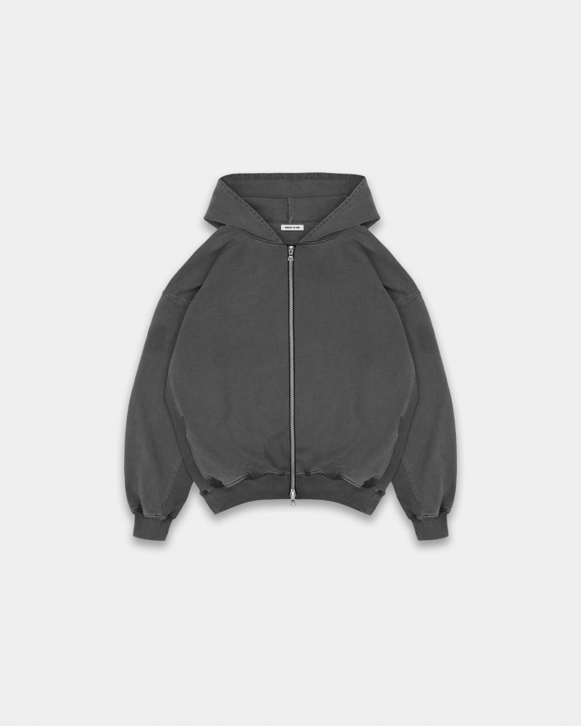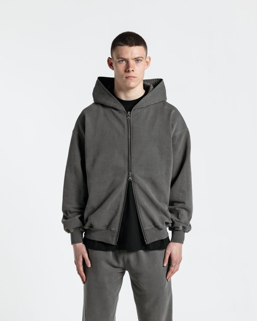 The Angels To God Timeless Zipped Hoodie in Washed Black. Our heavyweight zipped hoodie features a two-way metal riri zip. The signature ribbed side panel is sewn into the sides of the body. Hidden Pockets attached to the side between the jersey and the rib. Dropped shoulders and a double lined hood. Cut from a Luxury-weight 470GSM loopback cotton.